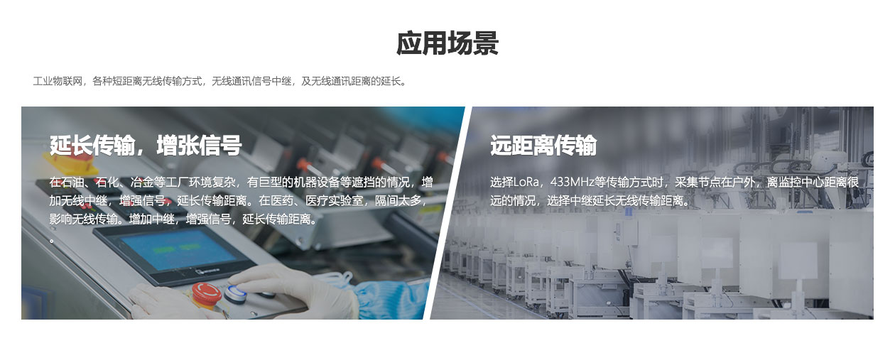 選擇LoRa,433MHz等傳輸方式時,采集節點在戶外,離監控中心距離很遠的情況,選擇中繼延長無線傳輸距離。 在石油、石化、冶金等工廠環境復雜,有巨型的機器設備等遮擋的情況,增加無線中繼,增強信號,延長傳輸距離。 在醫藥、醫療實驗室,隔間太多,影響無線傳輸。增加中繼,增強信號,延長傳輸距離。