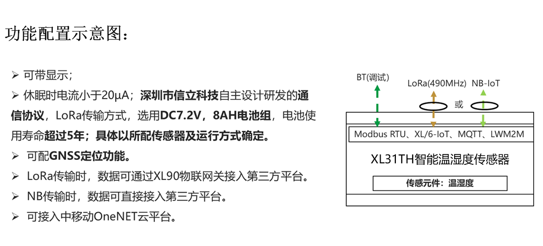 XL31TH智能溫濕度傳感器,集成傳感元件、信息處理、無線通訊、電池供電等于一體。通訊中斷保存數據,通訊恢復重傳數據,超限主動上傳數據,電池能量低上傳報警數據。