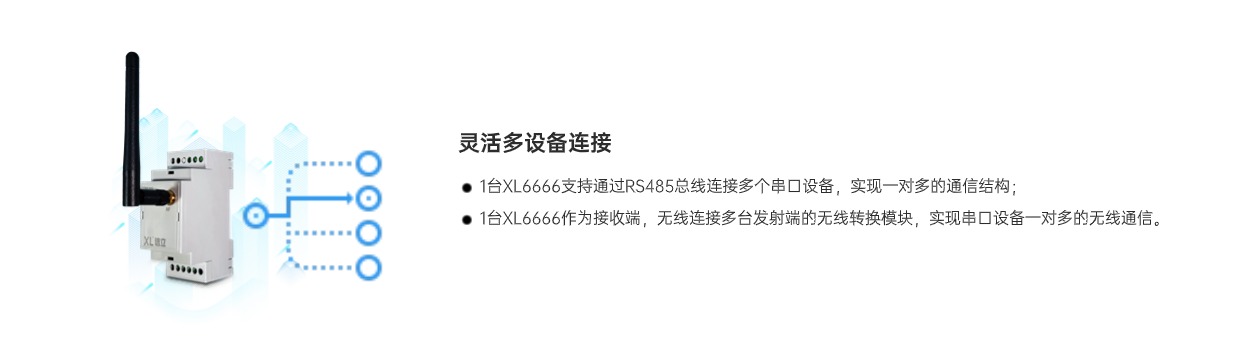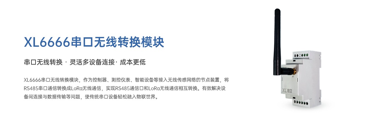 XL6666串口無線轉換模塊,作為控制器、測控儀表、智能設備等接入無線傳感網絡的節點裝置,將RS485串口通信轉換成LoRa無線通信,實現RS485通信口和LoRa無線通信相互轉換。有效解決設備間連接與數據傳輸等問題,使傳統串口設備輕松融入物聯世界。