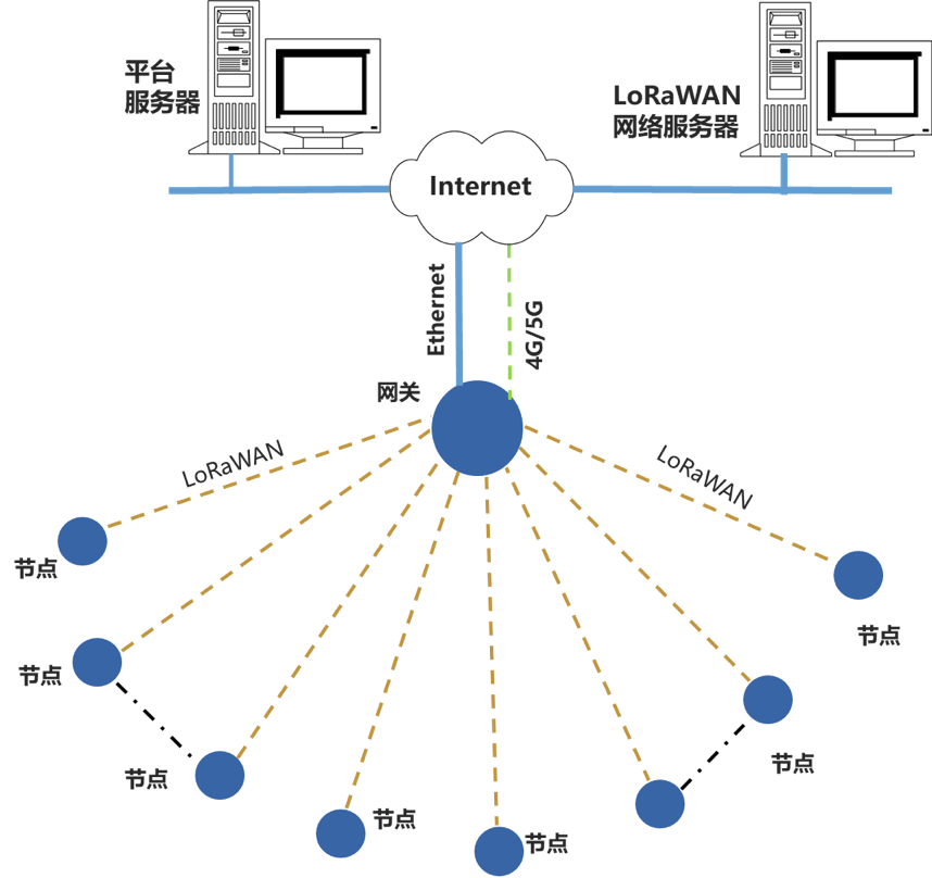 LoRaWAN構建標準的無線通信星形網絡;相同地區標準的LoRaWAN產品,都可上傳數據至不同品牌的LoRaWAN網關。