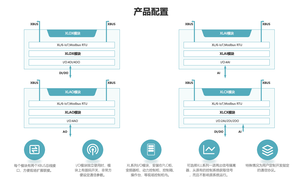 每個模塊有兩個XBUS總線接口,方便現場擴展聯接。XBUS可當作RS485口使用。I/O模塊上有撥碼開關,非常方便設定通信參數。可安裝在PLC柜、變頻器柜、動力控制柜、控制箱、操作臺,等現場控制柜內。