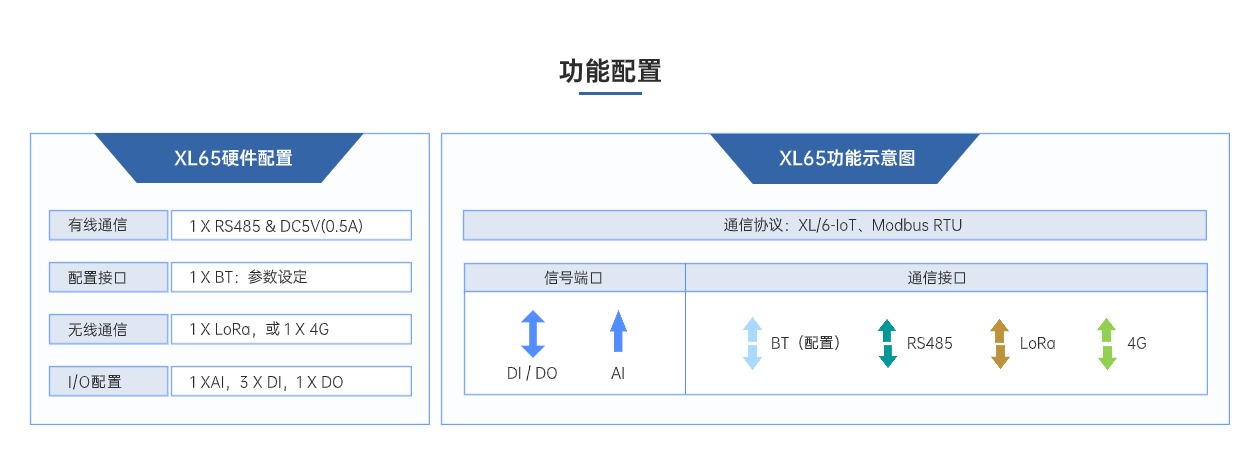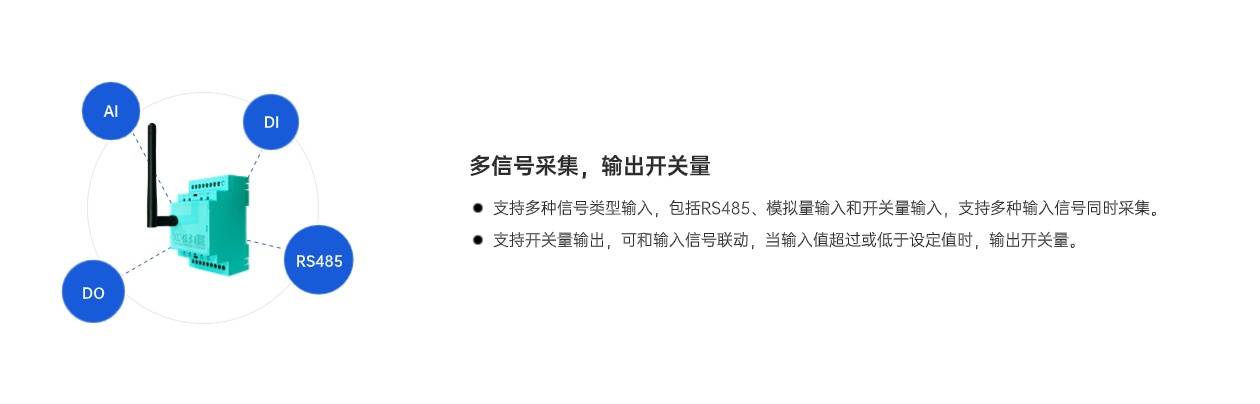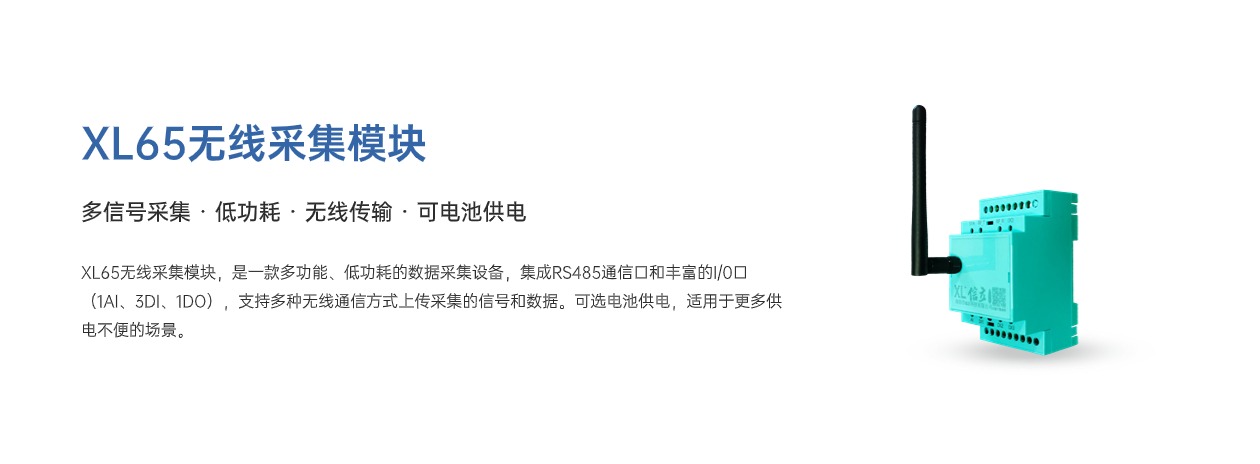 XL65無線采集模塊,是一款多功能、低功耗的數(shù)據(jù)采集設(shè)備,集成RS485通信口和豐富的I/0口(1AI、3DI、1DO),支持多種無線通信方式上傳采集的信號和數(shù)據(jù)。可選電池供電,適用于更多供電不便的場景。