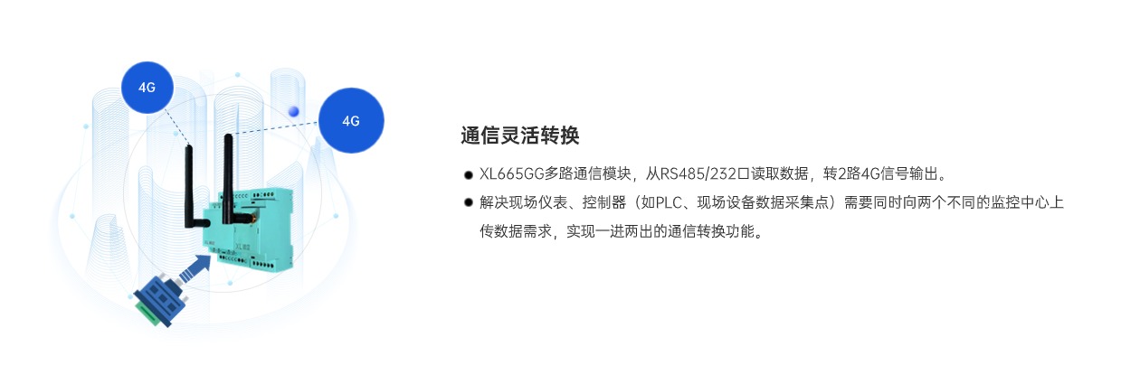 XL665GG多路通信模塊是一款高效靈活的通信轉換設備,可將RS485設備的一路輸出信號,轉為2路4G輸出信號,有效滿足了工控設備同時將數據接入兩個Modbus主站的需求,簡單、方便、易用,成本更低,滿足多種場景需求。