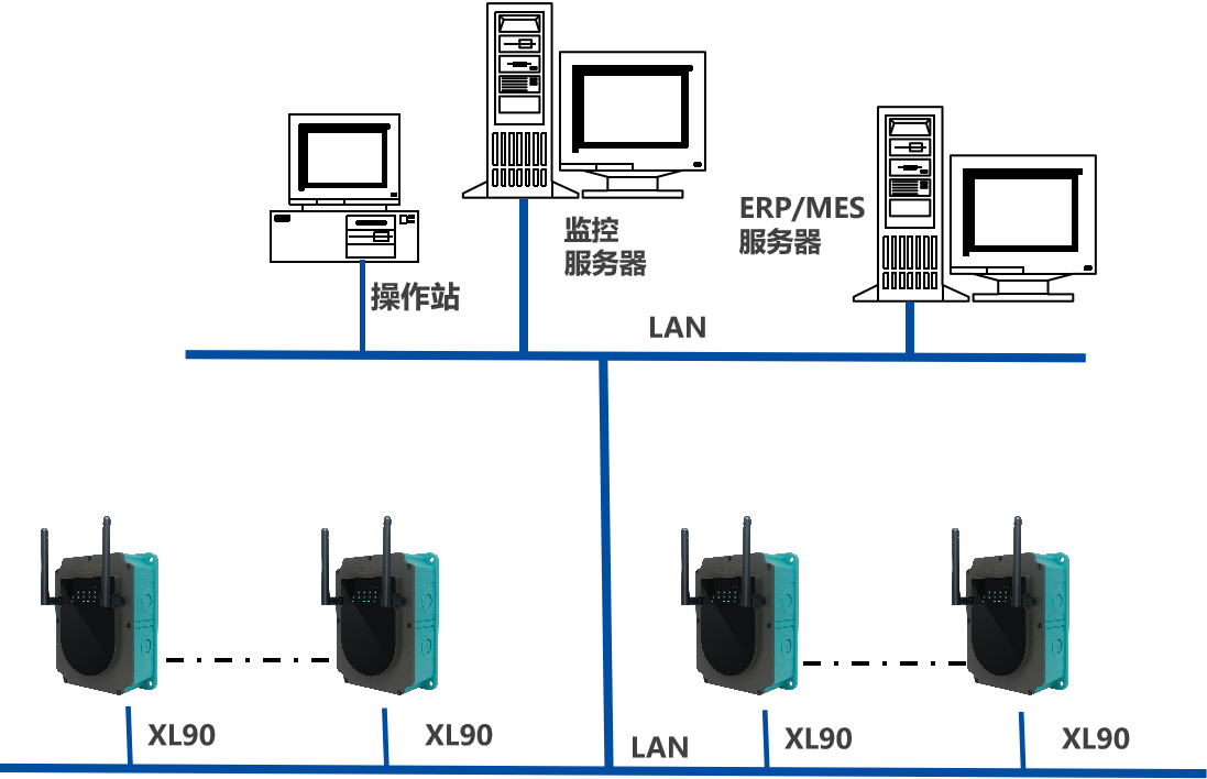 XL90物聯網關,是系統的核心,從XL60上讀取數據,進行協議轉換、通訊處理,通過企業內部LAN,推送數據至企業生產監控平臺