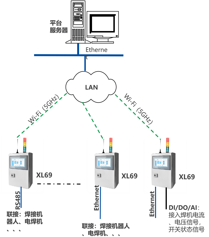 基于XIoT技術的電焊機運行監控系統,平臺由1套XL.Cloud軟件、1臺監控服務器構成;通信網絡多臺XL90物聯網關,或無線AP、網橋,及LAN構成