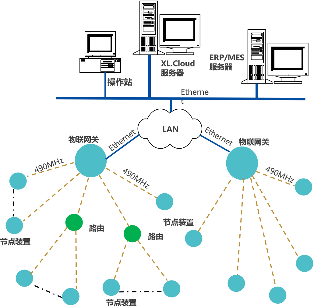 節點裝置(智能采集裝置/智能采集終端),通過490MHz上傳數據至物聯網關,網關通過Ethernet接入企業內部LAN,推送設備生產數據,至企業生產監控平臺