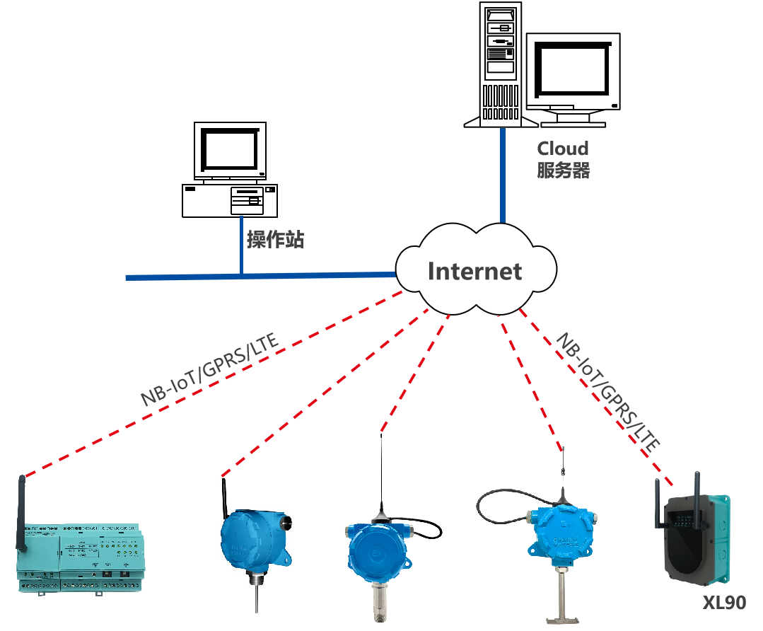 類似泵房、水廠、水源井等場所的數據監測,監測點的數據先上傳至XL90物聯網關,再通過NB/GPRS/LTE轉發數據至云平臺,此種情況,數以后在量大時,可選LTE(4g)方式