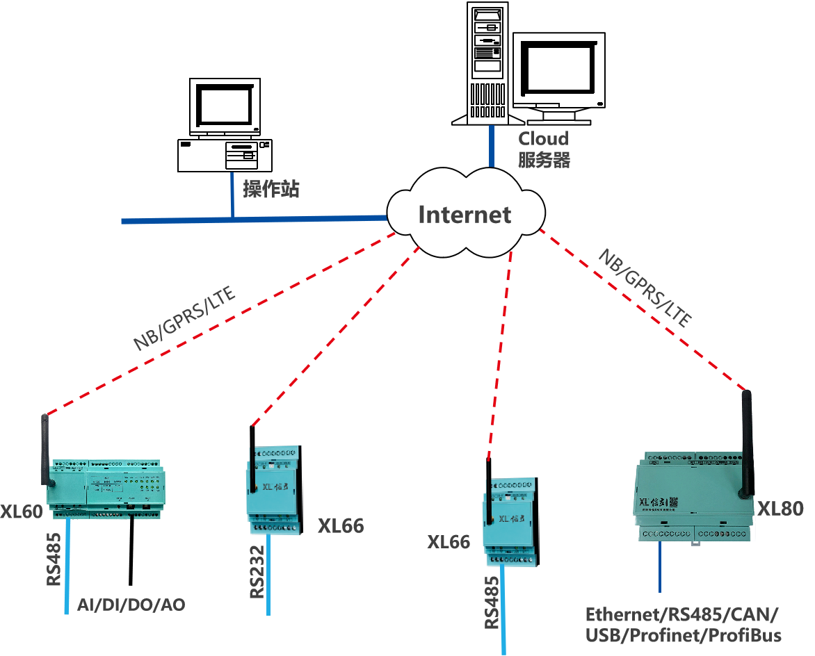 XL60智能采集裝置,通過RS485接口讀取數據,DI、DO、AI、AO接口采集、輸出信號,NB/GPRS/LTE通信;推薦NB/GPRS