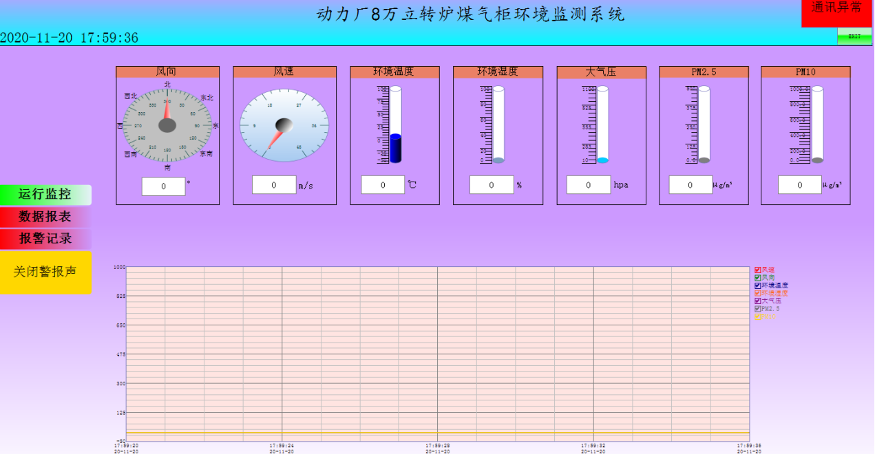 通過無線傳輸,實時監測轉爐煤氣柜的周邊環境情況,包括:溫濕度、風速風向、大氣壓力、PM2.5及PM10,并在PC界面顯示出來。