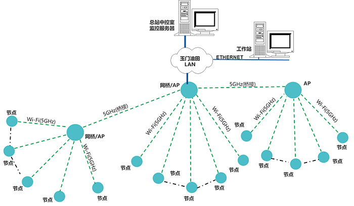 借助老君廟區域,玉門油田的內部局域網(LAN),設計傳輸網絡,傳輸采集節點的數據。并預留有LoRa和4G的通信方式,以應對其它地理環境下對傳輸方式的要求。