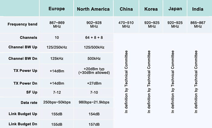 LoRa使用的是免授權(quán)ISM頻段,但各國或地區(qū)的ISM頻段使用情況是不同的。在中國市場,由中興主導(dǎo)的中國LoRa應(yīng)用聯(lián)盟(CLAA)推薦使用了470-518MHz。而470-510MHz這個頻段是無線電計量儀表使用頻段。由于LoRa是工作在免授權(quán)頻段的,無需申請即可進行網(wǎng)絡(luò)的建設(shè),網(wǎng)絡(luò)架構(gòu)簡單,運營成本也低。LoRa聯(lián)盟正在全球大力推進標(biāo)準(zhǔn)化的LoRaWAN協(xié)議,使得符合LoRaWAN規(guī)范的設(shè)備可以互聯(lián)互通。下圖是LoRa聯(lián)盟規(guī)范里提到的部分使用頻段: