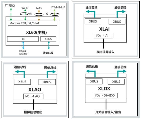 I/O模塊可選:XLDX(4DI/0-4DO)、XLAI(0-4AI)、XLAO(0-4AO) ;