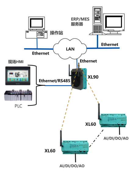 物聯(lián)網(wǎng)關讀取XL60上傳的數(shù)據(jù),通過Ethernet(以太網(wǎng))或RS485,上傳數(shù)據(jù)至監(jiān)控平臺、PLC、觸摸屏、控制器等設備,支持MQTT、 Modbus、API、寫數(shù)據(jù)庫等通信協(xié)議。