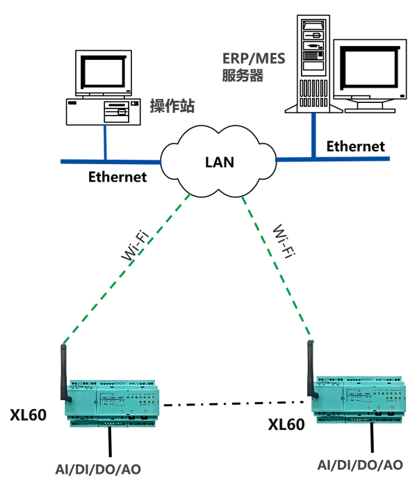 應用場景:工廠車間有獨立的工業(yè)據(jù)數(shù)據(jù)Wi-Fi網(wǎng)絡,或是Wi-Fi網(wǎng)絡可用于傳輸數(shù)據(jù);采集車間機器設備運行信號、工藝參數(shù)(溫度、壓力、位移、轉速、計數(shù)、產(chǎn)量......),通過LAN直接推送數(shù)據(jù)至監(jiān)控服務器;