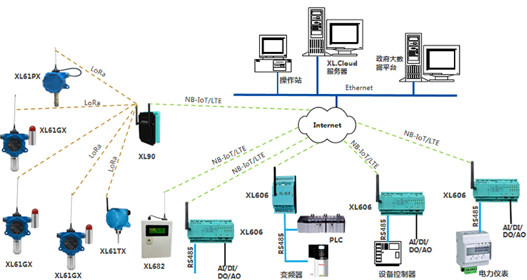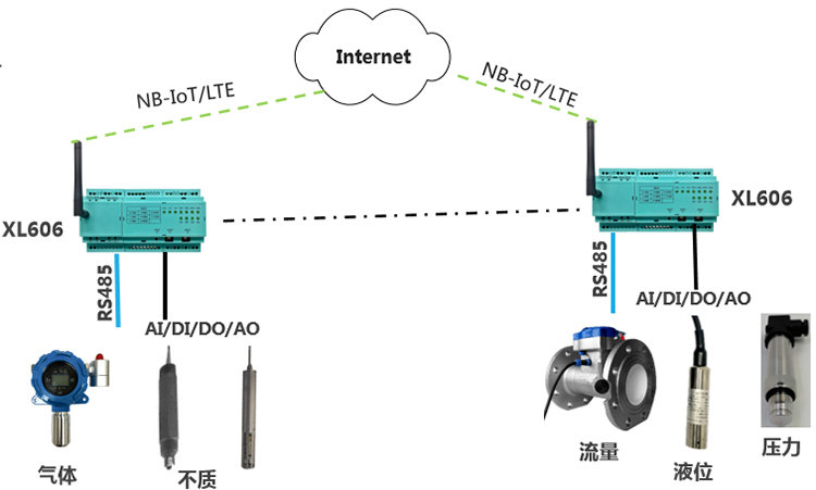 選擇XL60主機模塊,加I/O模塊,采集排放數據,通過NB/4G上傳至監控中心服務器,由于NB網絡覆蓋地域有限,建議選擇4G通信方式,資費差別不大;