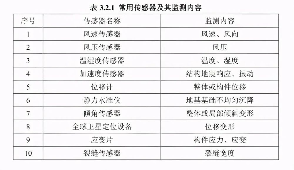 作為結構檢測最為重要的內(nèi)容,傳感器起到了最為關鍵的作用。從結構檢測常用的傳感器類型來看,風速傳感器、風壓傳感器、溫濕度傳感器、加速度傳感器、位移計、裂縫傳感器這些都是必備的,常用的傳感器及監(jiān)測指標見下圖。