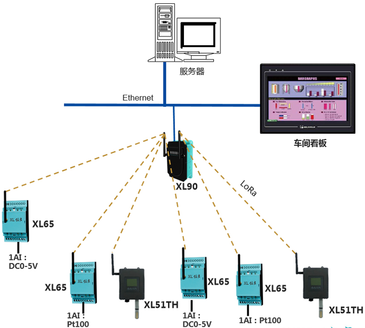 基于XIoT技術的絲印機電池電壓、電機溫度、絲印空間溫、濕度數據采集系統,選擇XL65無線采集裝置,和XL51TH溫、濕度傳感器,采集相關參數的數據,無線上傳至XL90物聯網關: