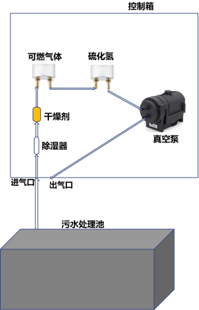 l 過程:用聚四氟乙烯管,聯接整個氣體通路。管直接伸入污水池,聯接控制箱進氣口,氣體從進氣口,至過濾器、除濕器,至傳感器探頭進、出氣口(兩臺傳感器的進、出氣口串聯),至真空泵抽氣口,從真空泵排氣口聯接控制箱出氣口;