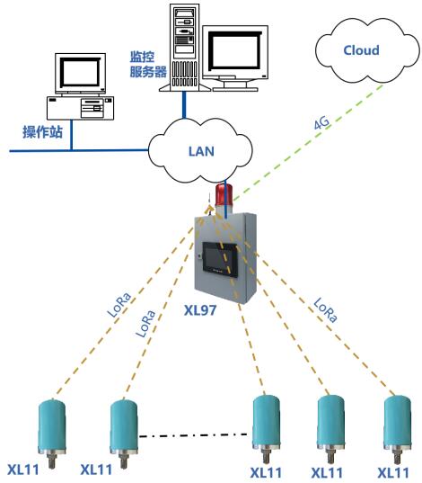 XL11系列傳感器采集設備運行過程電動機、減速機等零部件的溫度、振動數據,并通過 LoRa 或 LoRaWAN 無線通信方式,接入XL97物聯網關終端,網關通過Ethernet、Wi-Fi、4G接口連接SCADS、DCS或云端監控平臺,支持MQTT、API、SOAP(WEB Service )、Modbus RTU/TCP協議。
