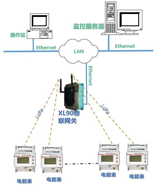 DTSD3366XX/XL無線多功能電能表獲取數(shù)據(jù),通過LoRa無線傳輸方式上傳至XL90網(wǎng)關(guān);XL90網(wǎng)關(guān)計(jì)算分析讀取的能耗數(shù)據(jù),并通過Ethernet、Wi-Fi、4G等通信方式,將數(shù)據(jù)上傳至XLSCADA平臺(tái)。