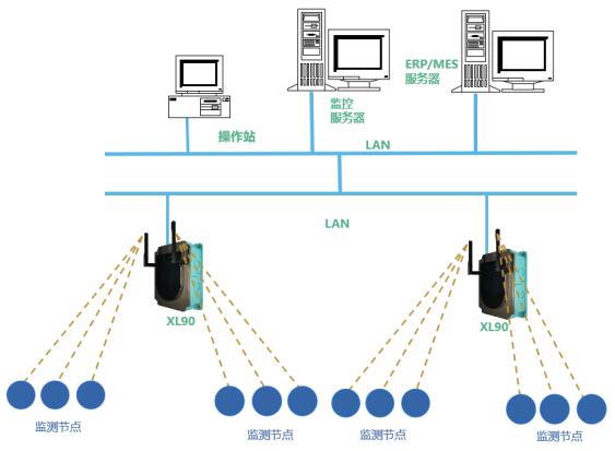 解決方案:XL90物聯(lián)網(wǎng)關(guān)無線讀取監(jiān)測節(jié)點的數(shù)據(jù),進行處理、協(xié)議轉(zhuǎn)換,通過以太網(wǎng)(Ethernet)或Wi-Fi,接入局域網(wǎng)轉(zhuǎn)發(fā)數(shù)據(jù)至MES、ERP、EMS等工廠數(shù)字化平臺。