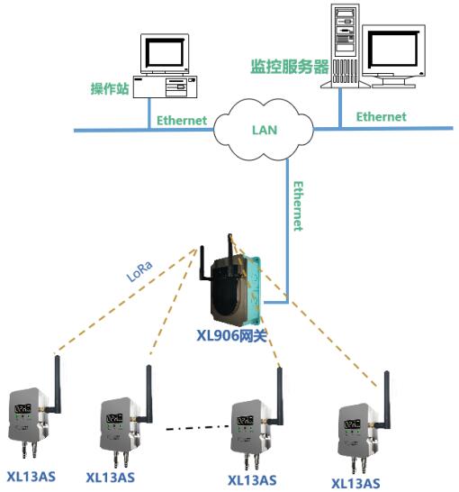 根據現場實際情況,部署XL906物聯網關,XL13AS無線風管風速傳感器通過LoRa無線傳輸數據至XL906物聯網關,網關可選Ethernet、Wi-Fi4G等多種方式將風速數據傳輸至監控平臺。