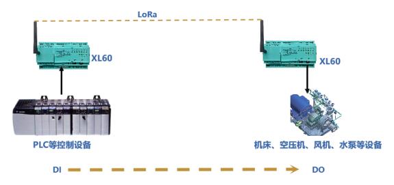 一對(duì) XL60 無(wú)線(xiàn)采集裝置 ,一臺(tái)與 PLC 等控制儀表連接,作信號(hào)發(fā)射端;一臺(tái)配置在生產(chǎn)現(xiàn)場(chǎng),作信號(hào)接收端。發(fā)射端的 XL60 將控制儀表的啟停命令,通過(guò) LoRa 無(wú)線(xiàn)對(duì)傳到接收端,接收端的 XL60 輸出開(kāi)關(guān)量信號(hào),控制設(shè)備啟、停。