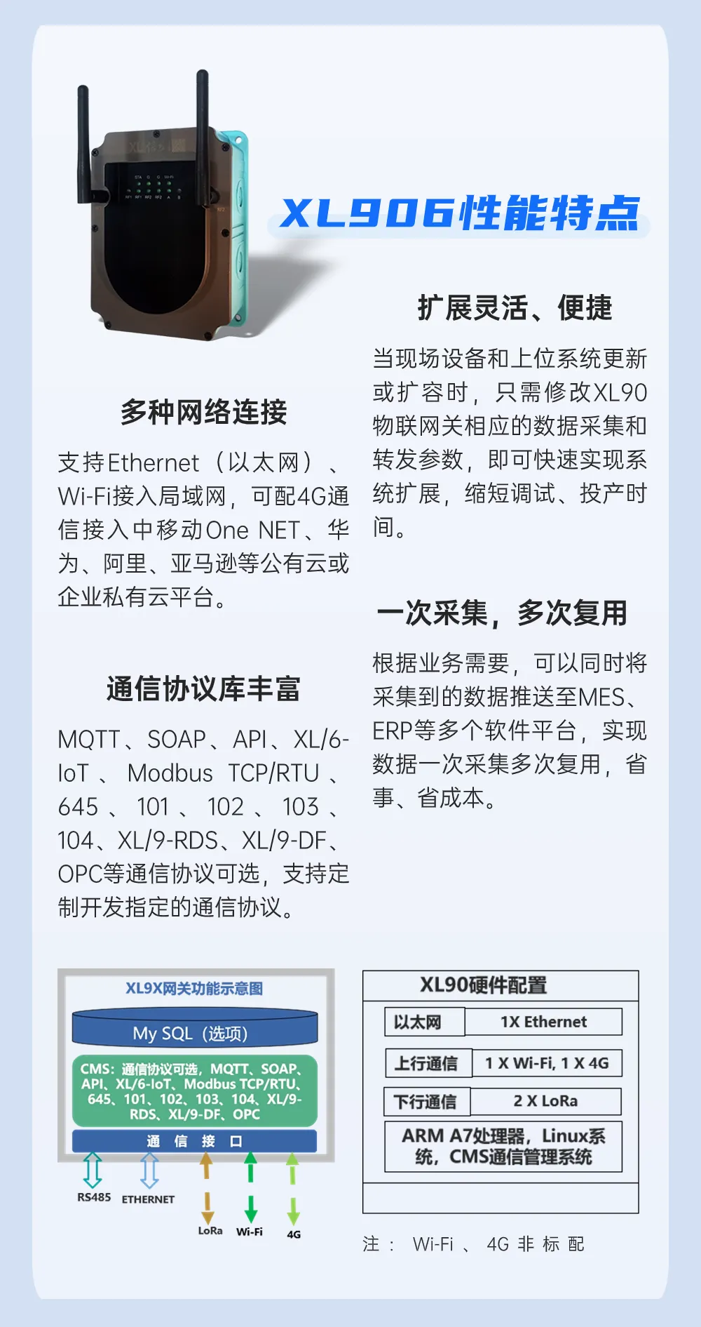 XL906物聯(lián)網(wǎng)關(guān)是信立工業(yè)物聯(lián)網(wǎng)(XloT)的核心,是節(jié)點(diǎn)和平臺(tái)之間的通訊樞紐和橋梁,啟動(dòng)、管理通信網(wǎng)絡(luò),協(xié)調(diào)節(jié)點(diǎn)通信,實(shí)現(xiàn)通信數(shù)據(jù)管理、協(xié)議轉(zhuǎn)換,向多平臺(tái)轉(zhuǎn)發(fā)數(shù)據(jù),構(gòu)建更穩(wěn)定、更可靠、更安全的無線通信網(wǎng)絡(luò)。