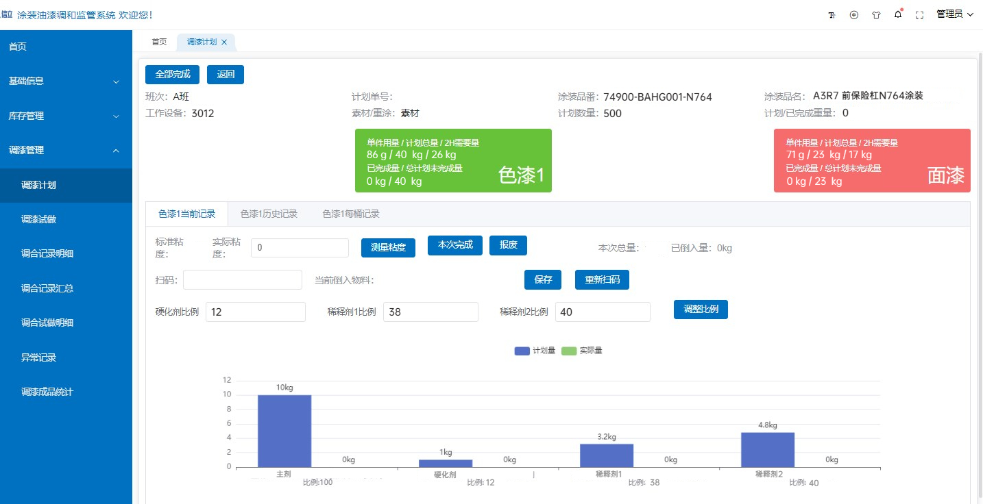 系統(tǒng)采用可視化直觀調(diào)漆界面設(shè)計(jì),根據(jù)調(diào)漆計(jì)劃智能匹配調(diào)漆工藝,自動(dòng)計(jì)算主劑、固化劑、稀釋劑需要的重量,以色塊的形式實(shí)時(shí)顯示已倒入的原料重量。