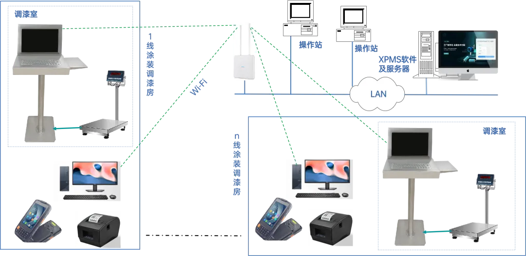 信立智能調漆系統(tǒng)由服務器及平臺軟件、調漆終端、出入庫終端、Wi-Fi網絡構成。