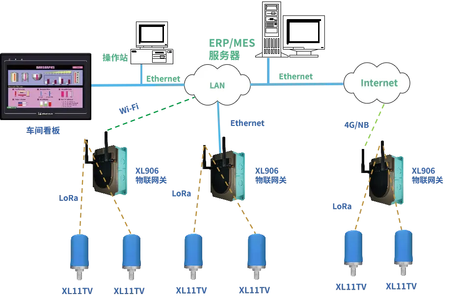 XL11智能溫振傳感器通過LoRa無線傳輸溫度和振動數據至XL906物聯網關,網關對數據進行處理、協議轉換,通過Ethernet、Wi-Fi、4G等通信方式,將數據上傳至監控中心或云平臺。